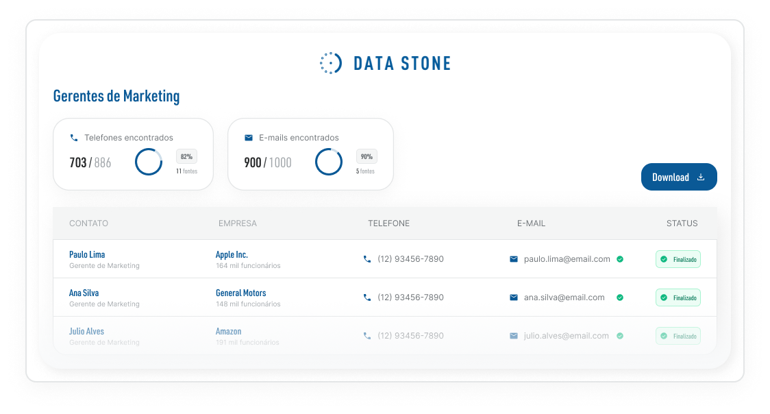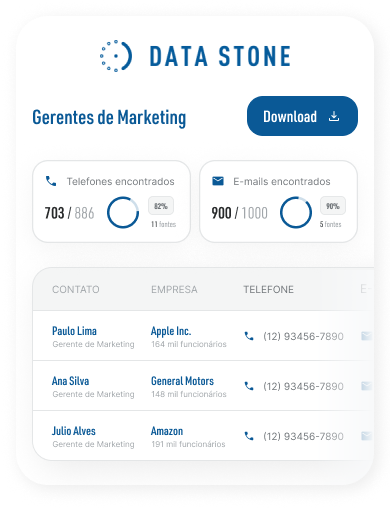 No mercado de dados há mais de 7 anos, a empresa é referência em soluções para prospecção B2B, enriquecimento de dados e inteligência comercial. Líder em qualidade de dados de telefone e e-mail, a Data Stone tem mais de 2 mil clientes ativos e atende com eficiência empresas de pequeno a grande porte quando o assunto é dados.
